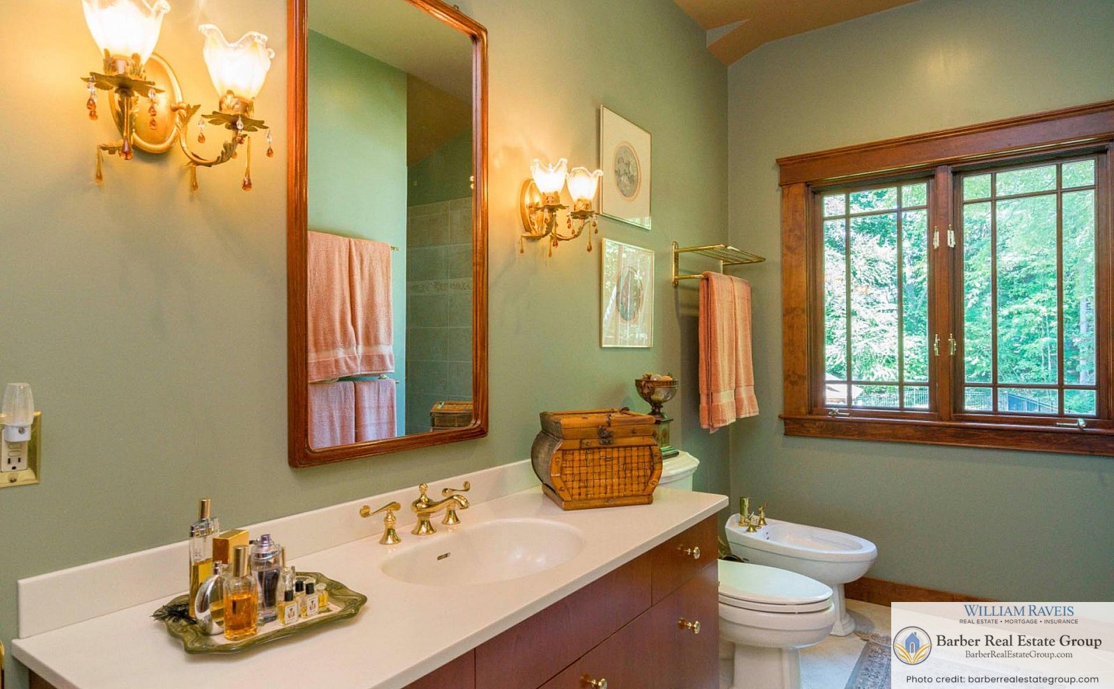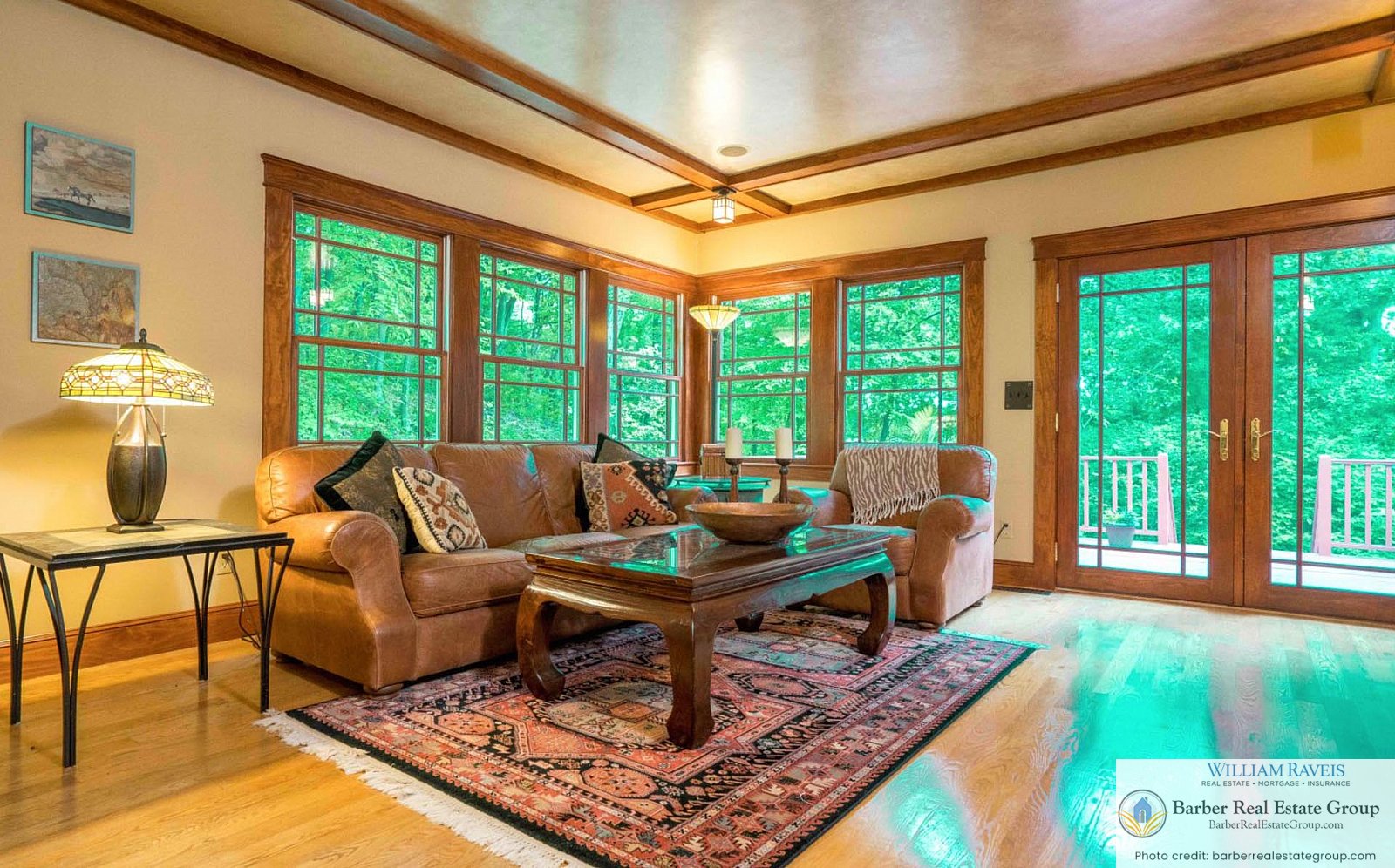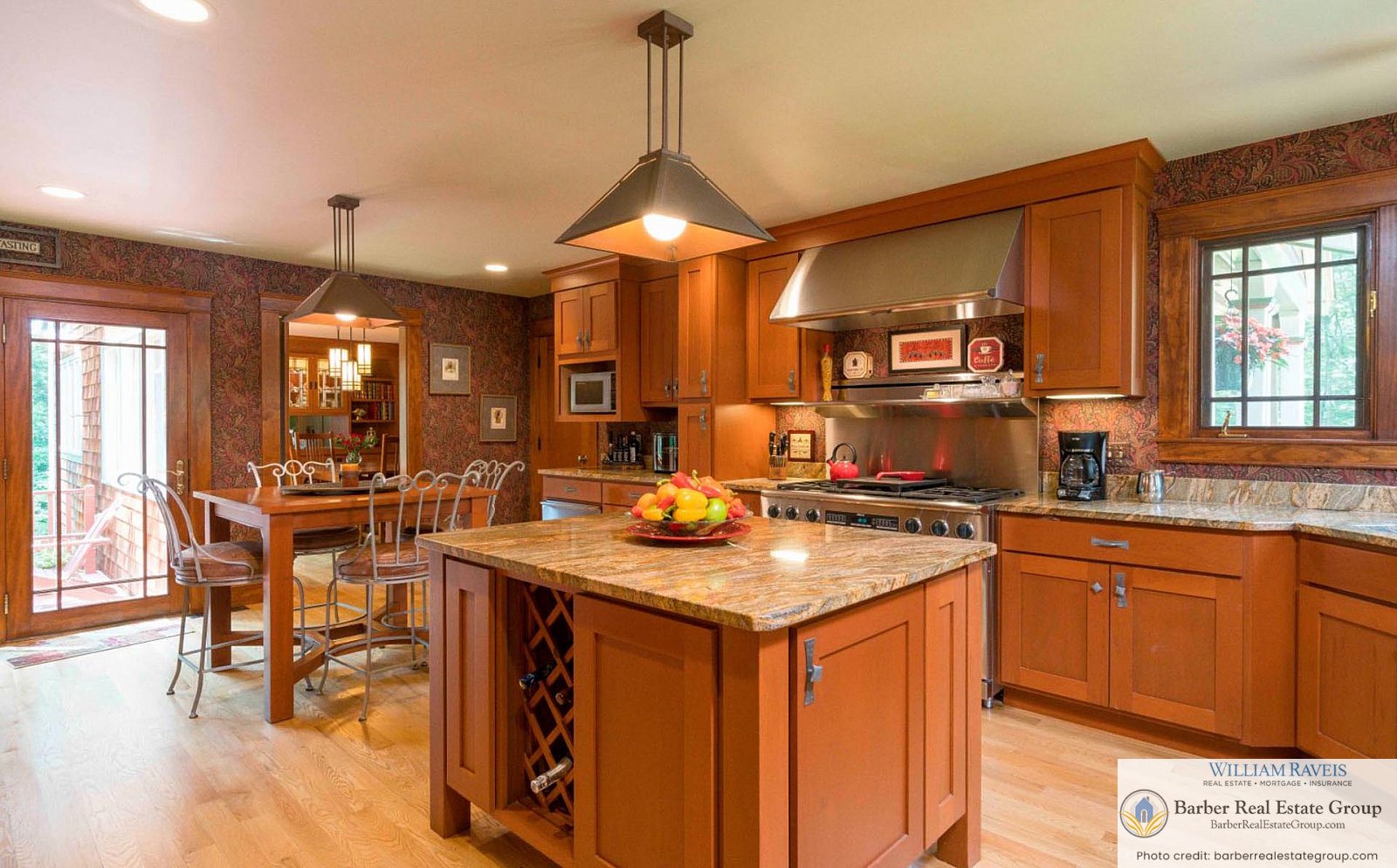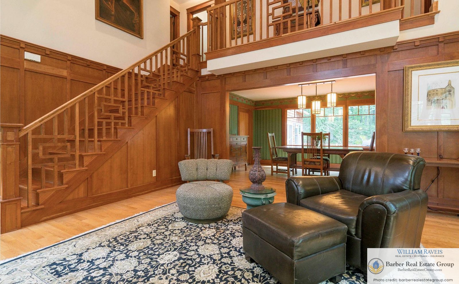 This homage is most evident in the living room, where a stately river stone fireplace and Craftsman-style wood wainscoting take center stage. The same meticulous attention to detail continues throughout the home, especially in the kitchen and dining room, where rich woodworking and period-inspired wallpaper add warmth and authenticity.